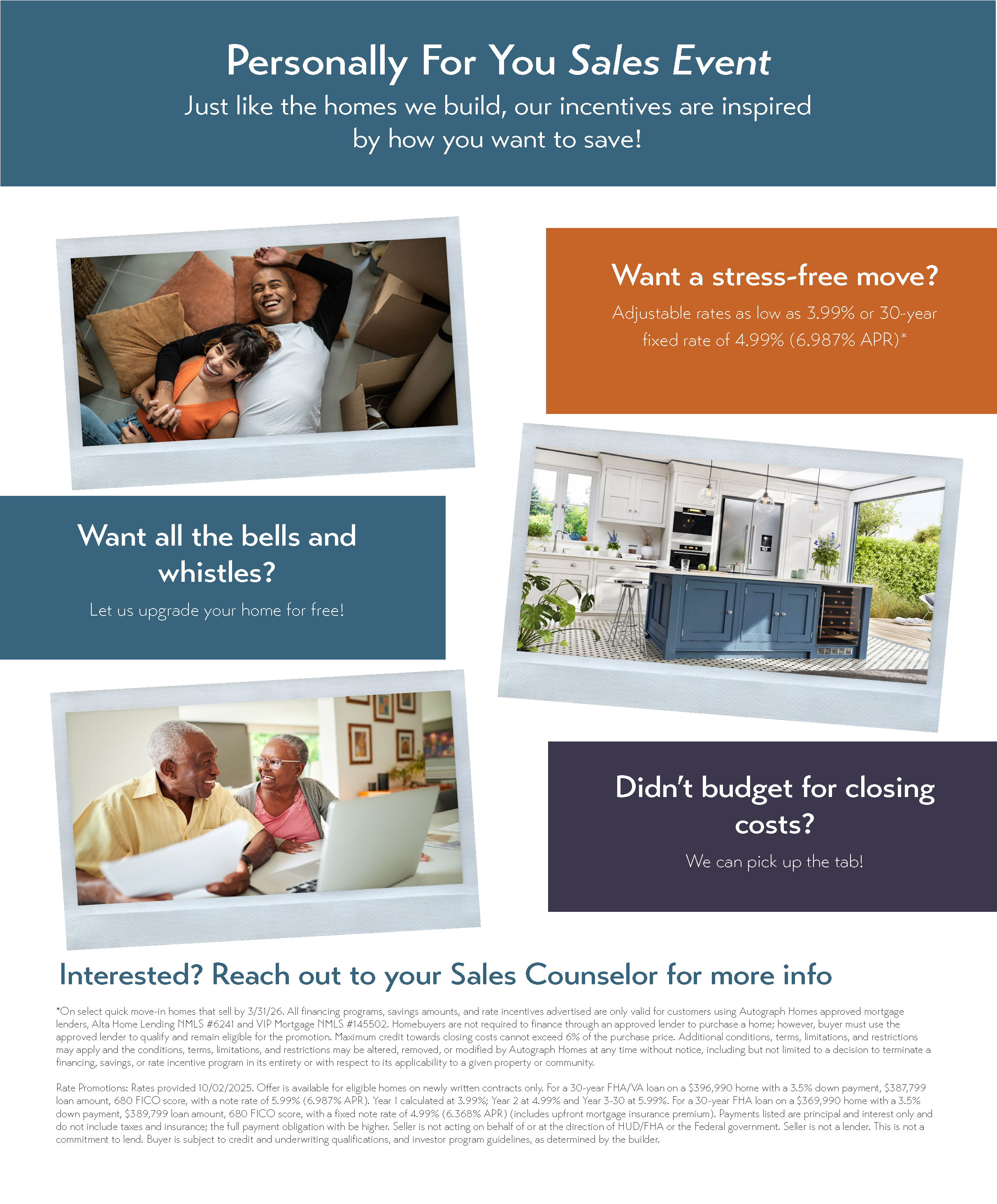 Flexible incentives designed to help you save at closing, lower your monthly payment, or personalize your new home.